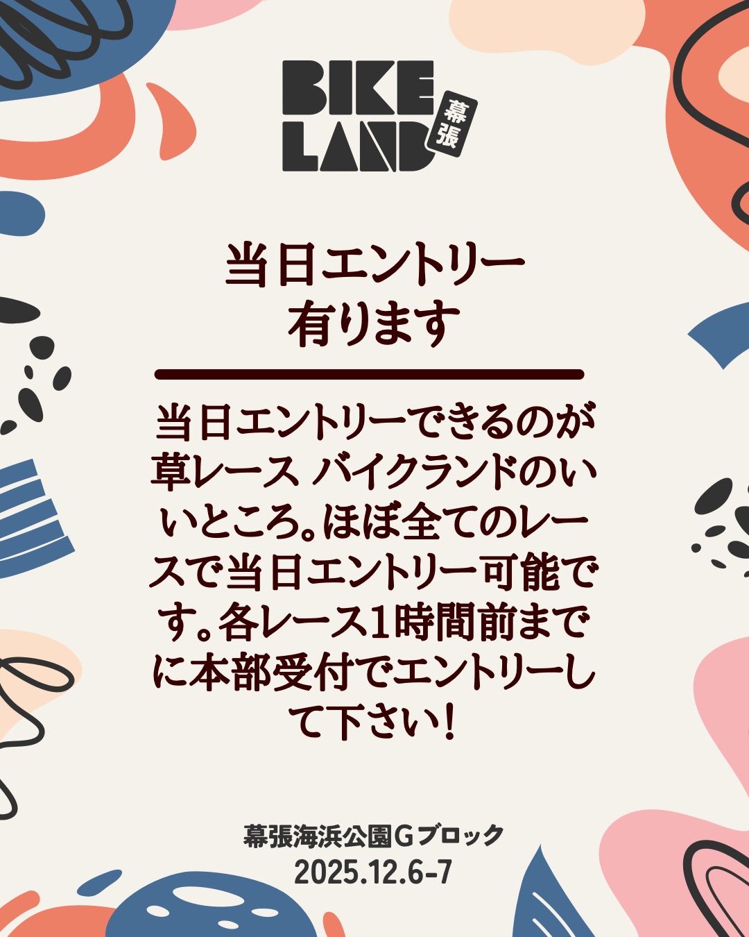 バイクランドは草レース。ぶらっと行ってエントリーして走れるのがその醍醐味です。秋ヶ瀬は人気でエントリーが事前に埋まってしまいがちだったんですが、新会場なので今回は少なめ。昔のように当日エントリーできるようになりました。プライズはかなり豪華なので逆にチャンスかも!?自転車とヘルメット持ってきてレースを走ってみよう!!レース以外にも色々なイベントもありますよ!